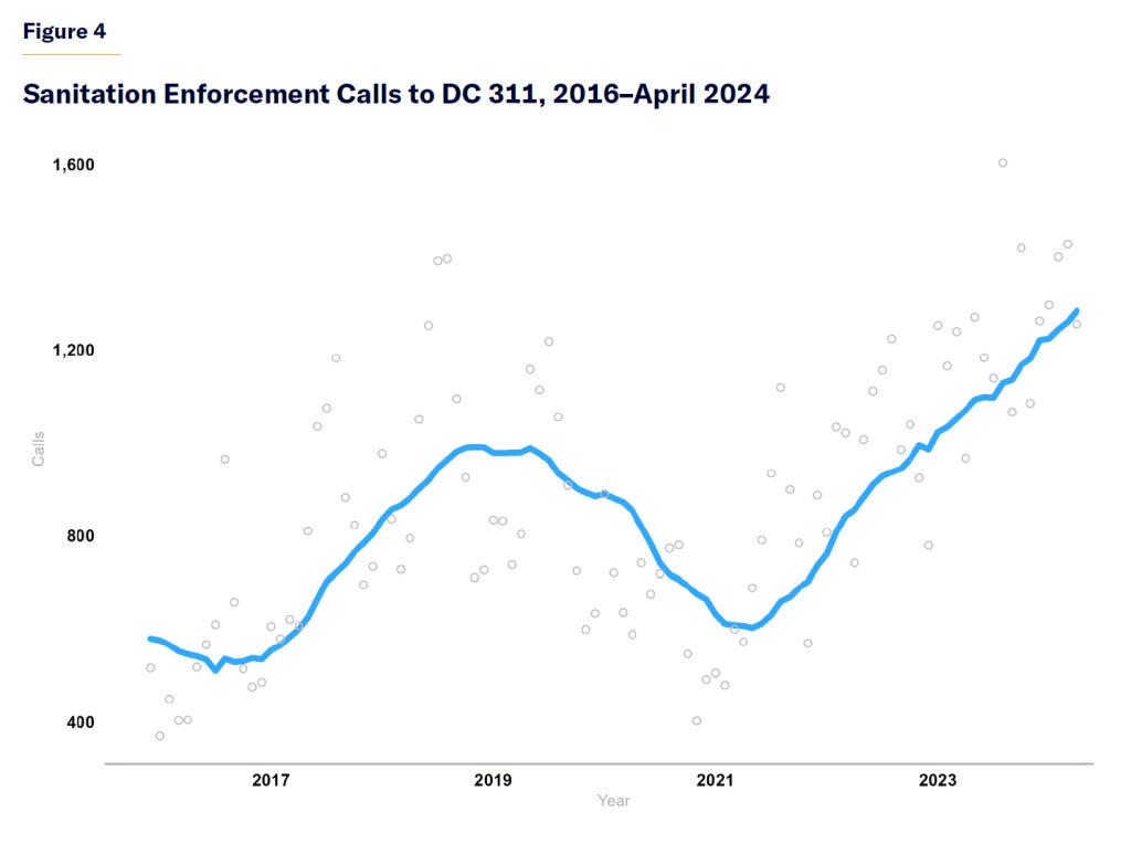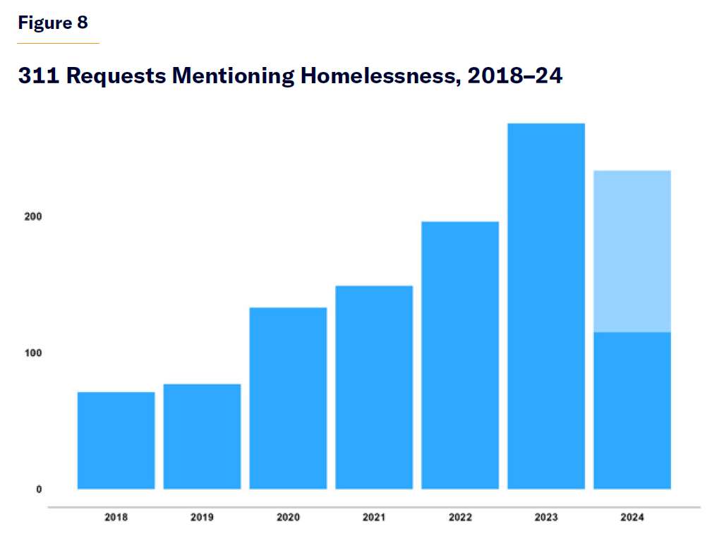 A similar pattern emerged in my recent report on crime in Washington, D.C. There, too, there are signs that disorder has risen, relative to both the pandemic and pre-pandemic, as the police have attended to it less. Unsheltered homelessness, unsanitary conditions, shoplifting, farebeating—all seem to have become more common in D.C. And those problems have come as a smaller police force has deprioritized order enforcement—if you look at table 2 of that report, you’ll see that arrests for minor crimes were down as much as 99% in 2023 relative to 2019.