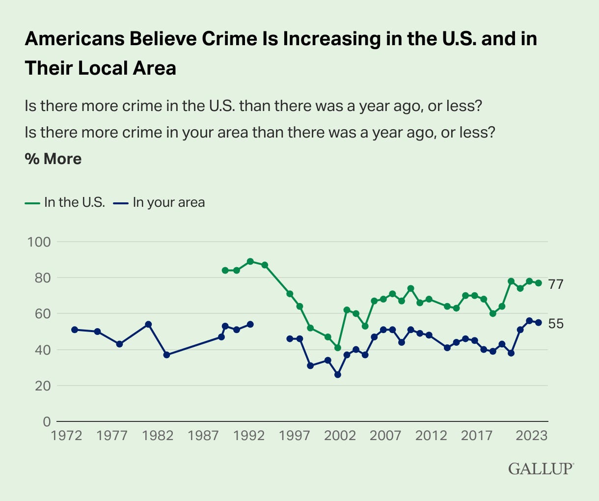 I was thinking about all of this in the context of the increasing mismatch between perception of crime and reality. Most kinds of crime are, by most measures, declining from their post-2020 peaks. That’s not true everywhere and across all crimes, but it appears to be true in the aggregate. But the result is some pundits engaging in what I labeled “crime-data trutherism”—insistence that the stats are fake, and that crime is actually surging. The public seems to agree, at least if Gallup is to be believed.