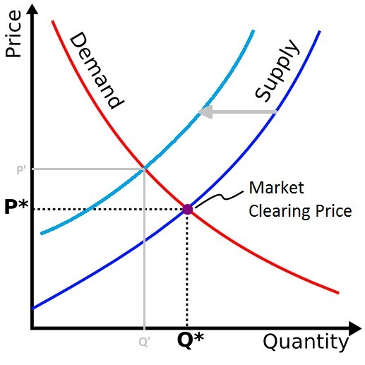 What almost everyone should be able to agree on is that the cost of regulations ends up reflected in the final price and quantity produced and consumed. The figure above is from an article about the effects of regulation on the health-insurance market, but the principle holds generally. The imposition of a regulation shifts the supply curve left, e.g. by excluding from the market those milk suppliers unwilling or unable to comply with health and safety requirements. If the demand curve remains constant, then the quantity supplied falls and the price rises.