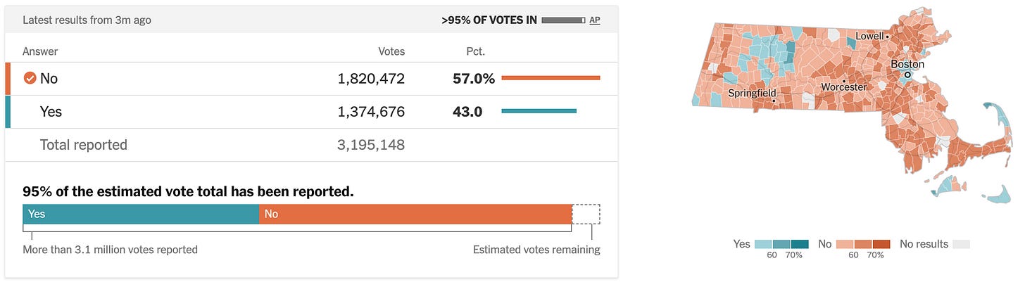 That kind of lopsided result was not restricted to Massachusetts, though. Yes, it happened at the top of the ticket. But across a variety of ballot initiatives and referenda you may have missed, progressive social policy came in for a drubbing: